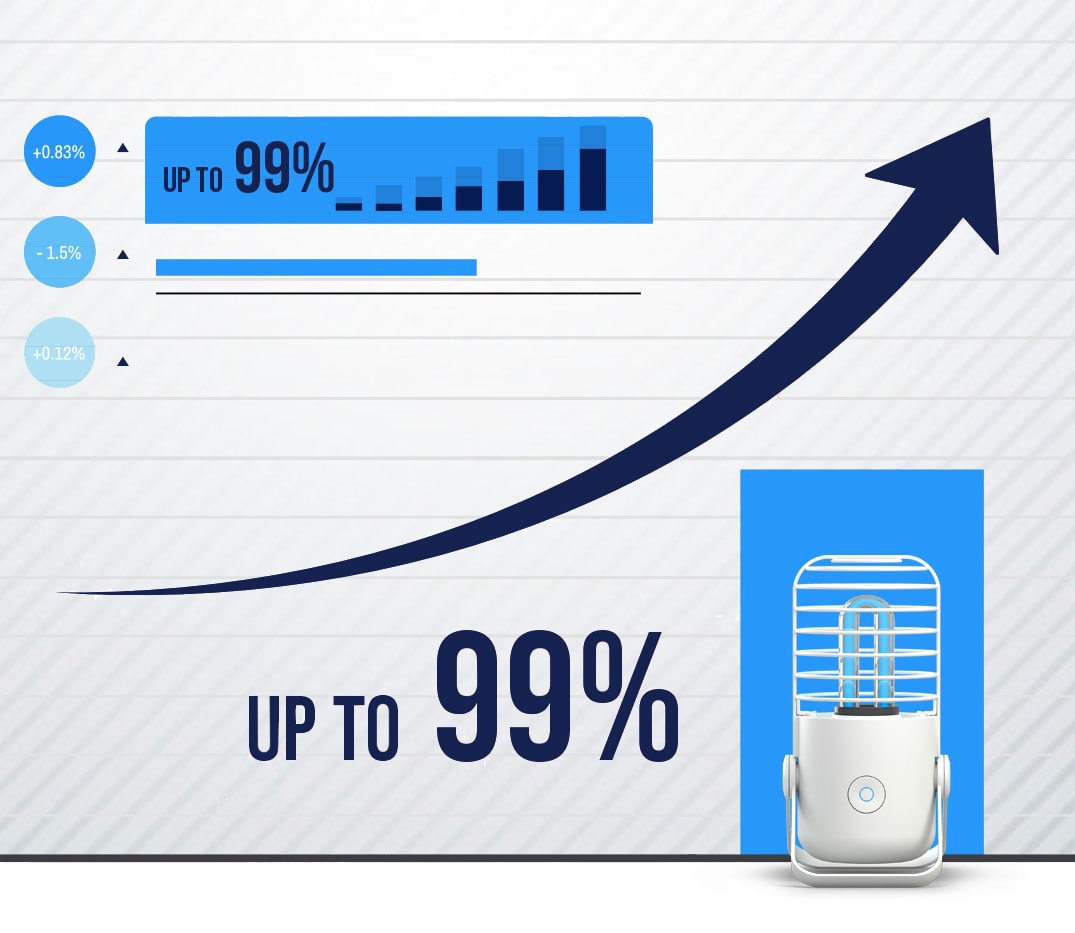 Toisin kuin nestemäiset puhdistusaineet, Sterilize-X ei jätä jäämiä tai toissijaisia epäpuhtauksia, eikä sen käyttäminen vaadi vaivannäköä! Kytke vain virta laitteeseen ja poistu huoneesta. Se on niin yksinkertaista. Puhdistuslampun kompakti muotoilu takaa maksimaalisen kannettavuuden: sijoita laite mihin tahansa ja se puhdistaa huoneen 360 asteen säteellä, ulottuen jokaiseen nurkkaan! Sterilize-X on uudelleenladattava ja se suojaa kaikkia koteja pitkään.